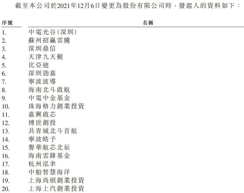 招股书显示,公司发起人包括中电光谷(深圳)、深圳鼎信、比亚迪、深圳劲嘉、宁波波导、海南北斗启航、珠海格力创业投资、海南云峰基金、上海上汽创业投资等。