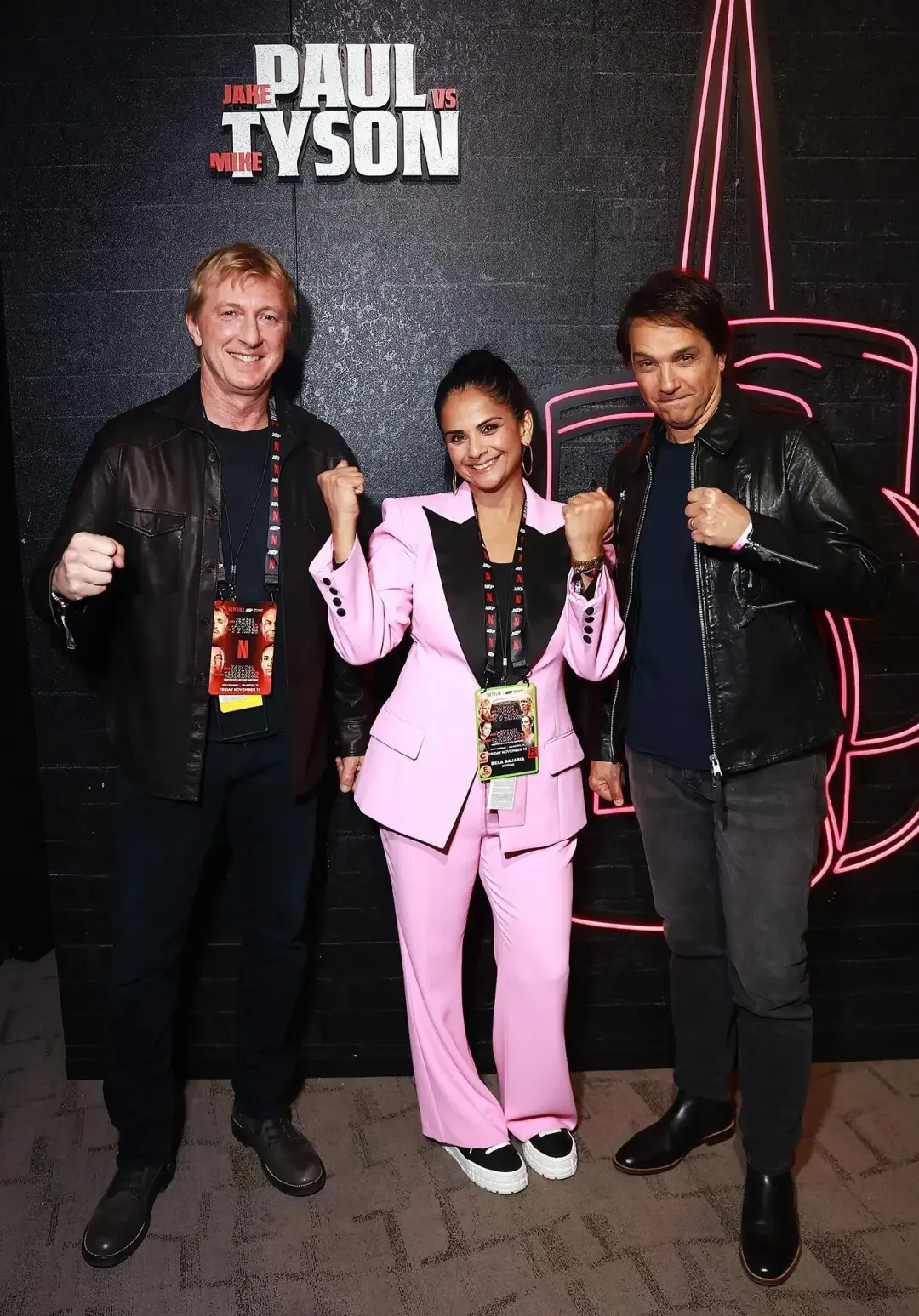 搏击赛事:巴贾里亚与Netflix明星威廉·泽布卡(William Zabka)、拉尔夫·马基奥(Ralph Macchio)合影。巴贾里亚于2024年促成保罗与泰森的拳击赛,该赛事成为历史上收视最高的流媒体体育赛事。图片来源:MATT WINKELMEYER/GETTY IMAGES