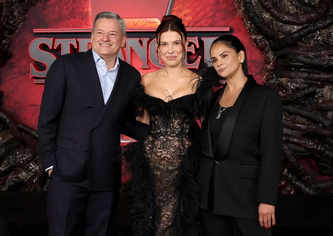 助力《怪奇物语》:巴贾里亚与Netflix首席执行官泰德·萨兰多斯、演员米莉·博比·布朗(Millie Bobby Brown)共同出席《怪奇物语》(Stranger Things)最终季首映礼。图片来源:KEVIN WINTER/GETTY IMAGES