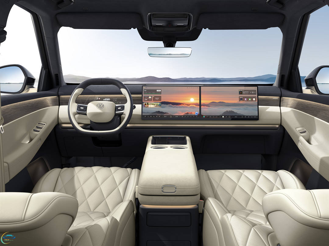 ID.ERA 9X首次曝光的内饰官图,能够清晰看到中控、副驾与二排通道上方的3块大屏,其中智能中控、副驾采用了15.6英寸超清双联屏,后排则采用了21.4英寸可折叠吸顶大屏——这款大屏还搭配有视角补偿膜,后排乘客从多个角度看向大屏,都能够获得沉浸式影音体验。